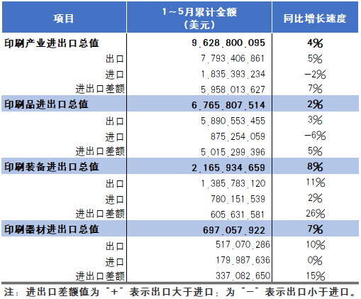 根據(jù)國(guó)家海關(guān)總署最新發(fā)布的統(tǒng)計(jì)數(shù)據(jù),2024年1~5月國(guó)內(nèi)印刷品、印刷裝備、印刷器材進(jìn)出口總值為96.29億美元(參見(jiàn)表1),與去年同期相比增長(zhǎng)4%。