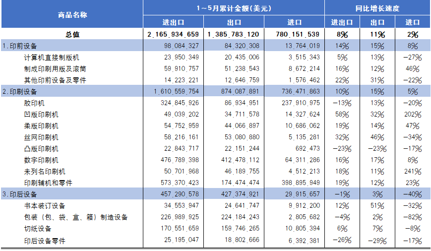 海關(guān)統(tǒng)計(jì)2024年1-5月國(guó)內(nèi)印刷品、印刷裝備、印刷器材進(jìn)出口動(dòng)態(tài)