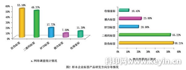 工藝技術(shù)創(chuàng)新在產(chǎn)品上的體現(xiàn),則主要集中于防偽標(biāo)簽、溯源和物流追溯標(biāo)簽、個性化促銷標(biāo)簽等產(chǎn)品領(lǐng)域。網(wǎng)絡(luò)調(diào)查反饋情況是:53.16%的樣本企業(yè)將主要研發(fā)方向定位于防偽標(biāo)簽,49.37%的樣本企業(yè)將可變信息二維碼標(biāo)簽作為主要研發(fā)方向,17.72%的樣本企業(yè)將研發(fā)RFID標(biāo)簽作為2016年的重點,7.59%的樣本企業(yè)在開發(fā)模內(nèi)標(biāo)簽,11.39%的樣本企業(yè)則在收縮套標(biāo)領(lǐng)域深耕,見圖2-a。而微信投票的統(tǒng)計結(jié)果則如圖2-b所示,其中研發(fā)模內(nèi)標(biāo)簽的占比較之網(wǎng)絡(luò)調(diào)查結(jié)果更突出。