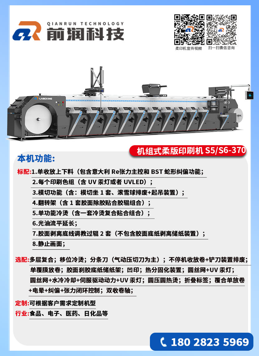 5、多功能印刷:柔版印刷為主,支持冷燙、覆膜、除膠、多層標簽、折頁標簽、在線品檢、模切等工藝,可選配絲印、噴碼、凹版等聯(lián)機功能。
