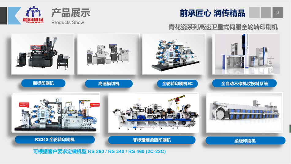 主營設(shè)備商標(biāo)印刷機衛(wèi)星式輪轉(zhuǎn)印刷機、模切機 等產(chǎn)品,公司可為客戶量身制定商標(biāo)機、輪轉(zhuǎn)機等自動化解決方案。公司有強大的研發(fā)體系,確保能為客戶量身定制各類非標(biāo)且最有價值的產(chǎn)品;前潤機械在國內(nèi)外擁有極高的市場占有率及良好的信譽,贏得了眾多知名企業(yè)的青睞與合作,產(chǎn)品暢銷多個國家和地區(qū),市場銷量近萬臺;我們愿與您攜手合作,建立長久雙贏機制,共享成功喜悅!加盟熱線:133 2260 8282