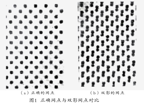 當(dāng)通過100倍的放大鏡或顯微鏡觀察印品時,印刷品上15%~25%網(wǎng)點區(qū)域會顯示出明顯的雙影問題。其表現(xiàn)是,在一個深色點子旁邊出現(xiàn)一個淺色點子或者是深色點子與淺色點子相互搭疊(見圖1)。其發(fā)生機理可以這樣解釋:由于油墨圖文從橡皮滾筒轉(zhuǎn)移到紙張上的過程中未能完全轉(zhuǎn)移,在橡皮布上留下了一個淺色的可印刷圖像。在下一印刷周期中,印版上轉(zhuǎn)移過來的新鮮的油墨圖像未能與橡皮布上殘留的圖像精確對準(zhǔn),轉(zhuǎn)移到下一張紙上的圖像就會形成雙影。這是網(wǎng)目調(diào)印刷的一個令人煩惱的問題。因為每一印張上的雙影情況都不相同,從而導(dǎo)致色彩濃淡無規(guī)律的變化。